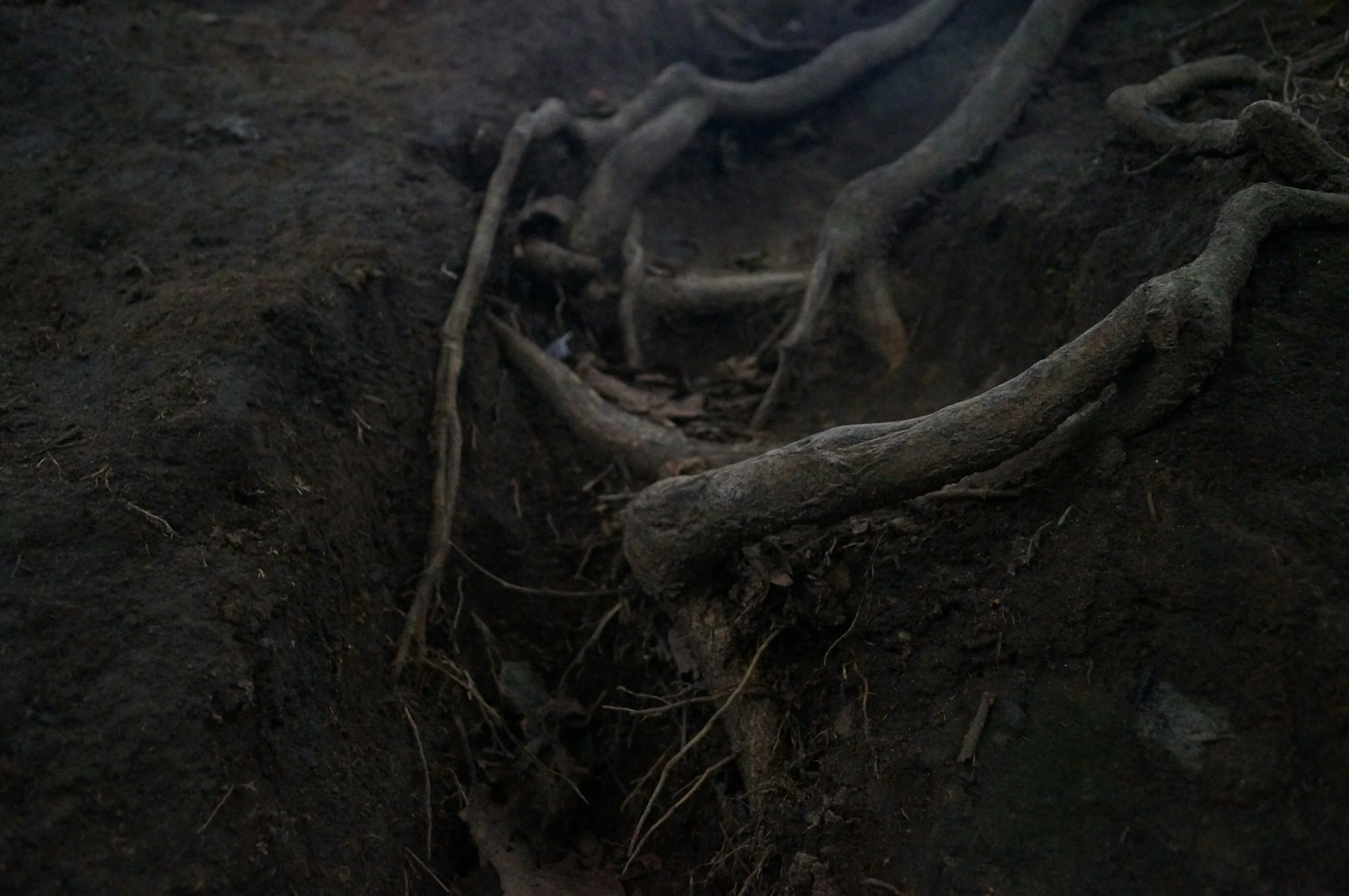 The shed to come needs a firm flat foundation which in turn needs an uneven patch of garden to be levelled, weeds, bricks, and stone…and hidden roots…removed