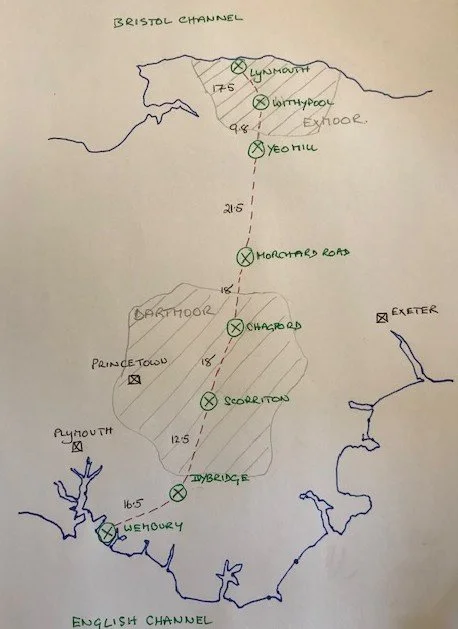 Bare Bones: Dartmoor to Exmoor, Wembury to Ivybridge to Scorriton to Chagford to Morchard Road to Yeo Mill to Withypool to Lynmouth. Approx. 115 miles